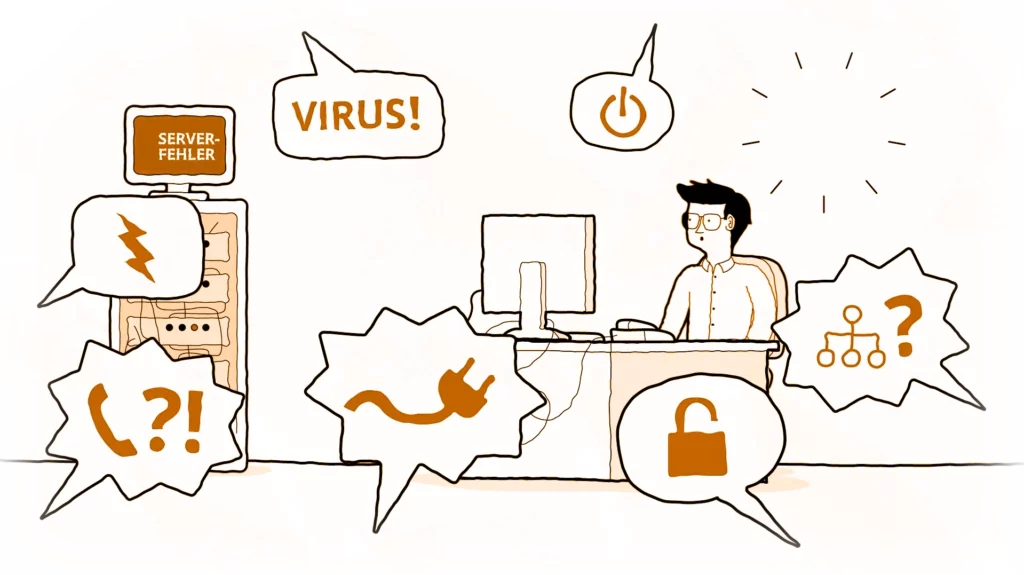 Ohne eine solide IT-Infrastruktur stehen Unternehmen ständig unter Druck. Cyberangriffe, Datenverluste und Systemausfälle verursachen Angst und Frustration. Kommunikationsprobleme und ineffiziente Arbeitsabläufe demotivieren die Mitarbeiter. Dieser ständige Stress gefährdet nicht nur die Effizienz, sondern auch die Zukunft des Unternehmens.